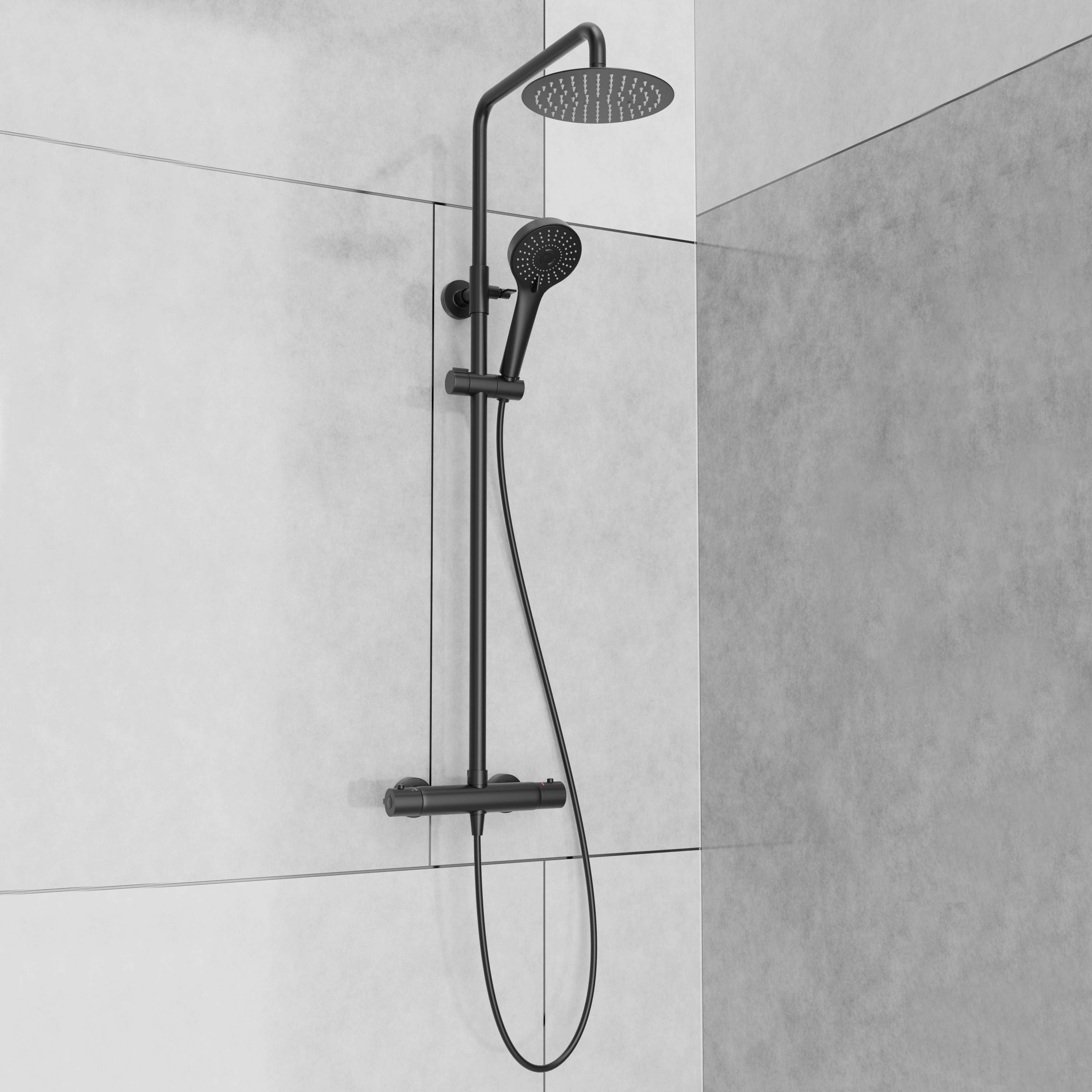 Et komplett takdusjsett med dusjbatteri og hånddusj inkludert. Utført i matt