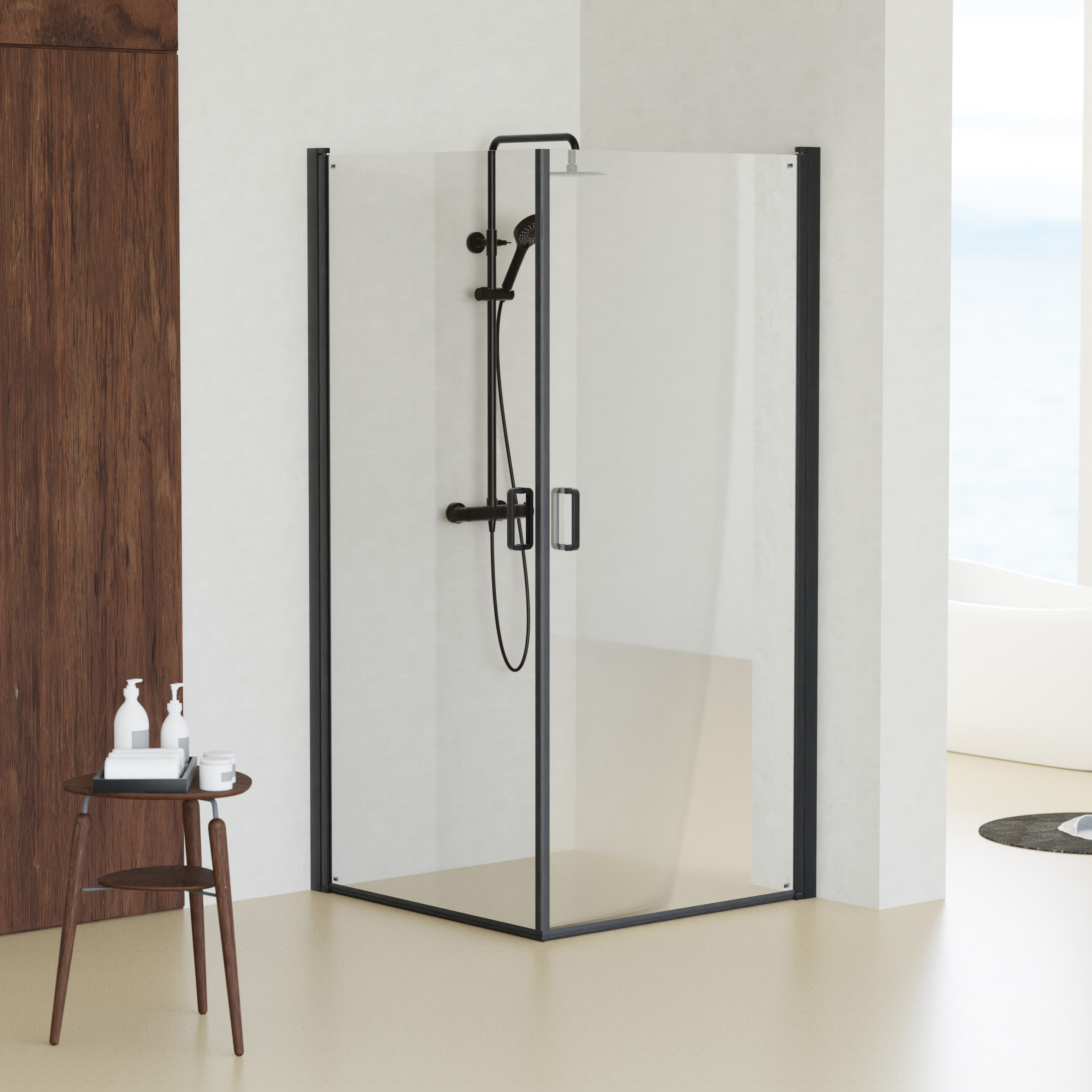 Et stilrent dusjhjørne med rette linjer og matt sort ramme som matcher