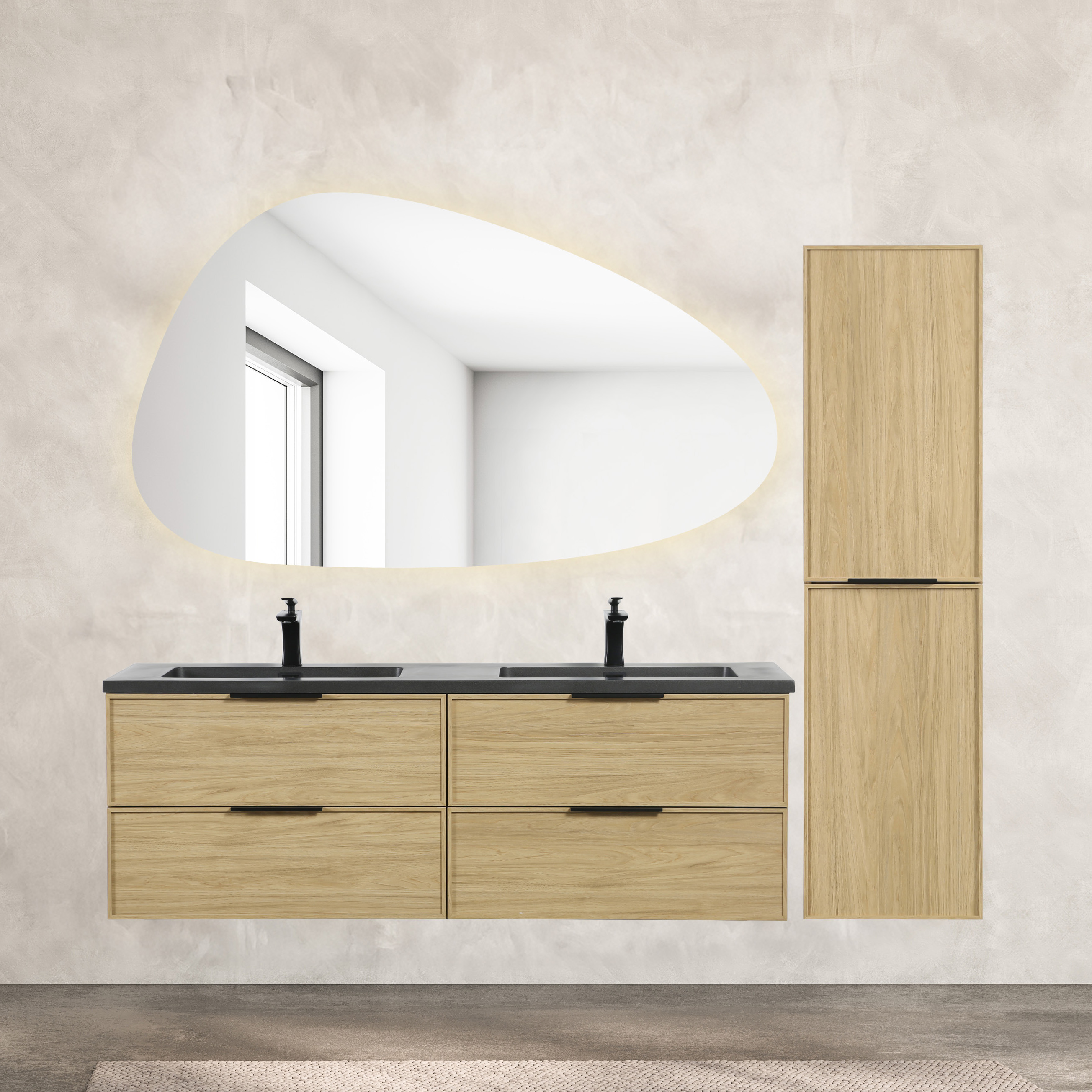 servant, høyskap og et asymmetrisk baderomsspeil med integrert LED-
